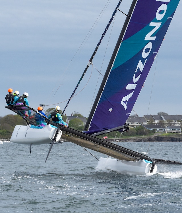 On Friday, the duo got to meet team AkzoNobel and take part in the Pro-Am M32 catamaran race in the harbor. Jim and Eric teamed up with team AkzoNobel helmsman Luke Molloy in an exciting race, coming in third overall!